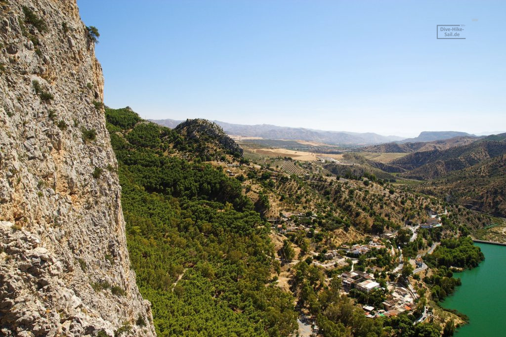Da wir aber auf etwas mehr Abenteuer und weniger Massentourismus stehen hatten wir uns für eine Alternative entschieden. In El Chorro gibt es nämlich noch einen anderen, echten Klettersteig, den Via ferrata del Chorro (https://alandalusactiva.com/actividades/vias-ferratas-en-andalucia/via-ferrata-del-chorro-o-del-caminito-del-rey/ leider nur auf Spanisch). Der Klettersteig hat eine mittlere Schwierigkeit, so dass er von Leute mit Klettersteigerfahrung sehr gut zu bewältigen ist. Wir hatten dann auch mehr mit der Hitze zu kämpfen und uns ist schnell klar geworden, warum El Chorro ein Winterklettergebiet ist. Der Via ferrata del Chorro hat dabei ein besonderes Highlight, kurz vor dem Ende hat der Klettersteig zwei Seilrutschen! Dafür braucht man natürlich eine Seilrolle. Diese (oder gleich die komplette Klettersteigausrüstung wenn man diese nicht mitschleppen möchte) kann man sich vorab bei einer Finca in der Nähe von El Chorro ausleihen (http://www.fincalacampana.com/en/via-ferrata.html). Schaut Euch auf der Seite die Bilder mit der Beschreibung des Zuganges an, da dieser etwas schwierig zu finden ist. Der Klettersteig bietet dann eine wunderschöne Aussicht über die Landschaft.