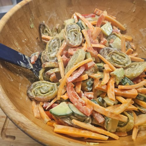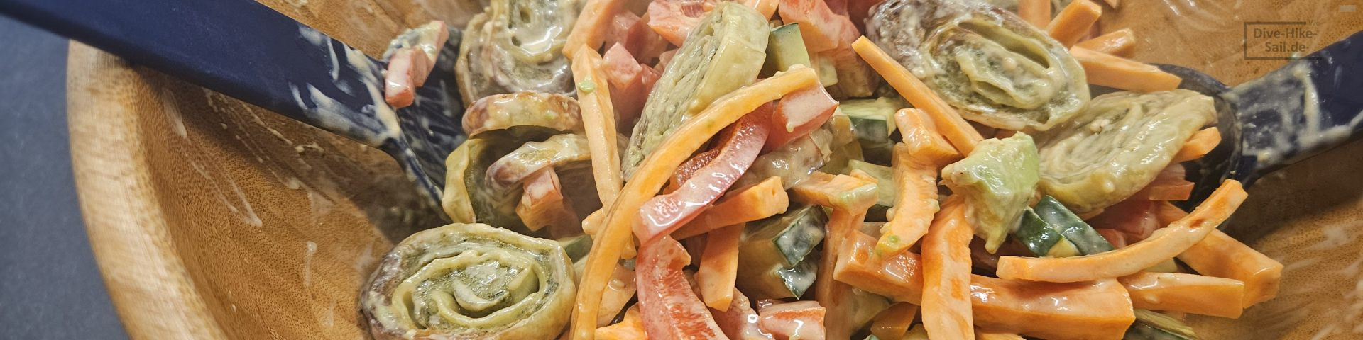 - Alle Zutaten für die Sauce vermengen. Sauce und Gemüse in einer großen Schüssel vermengen und die gebackenen Maultaschen darüber geben.