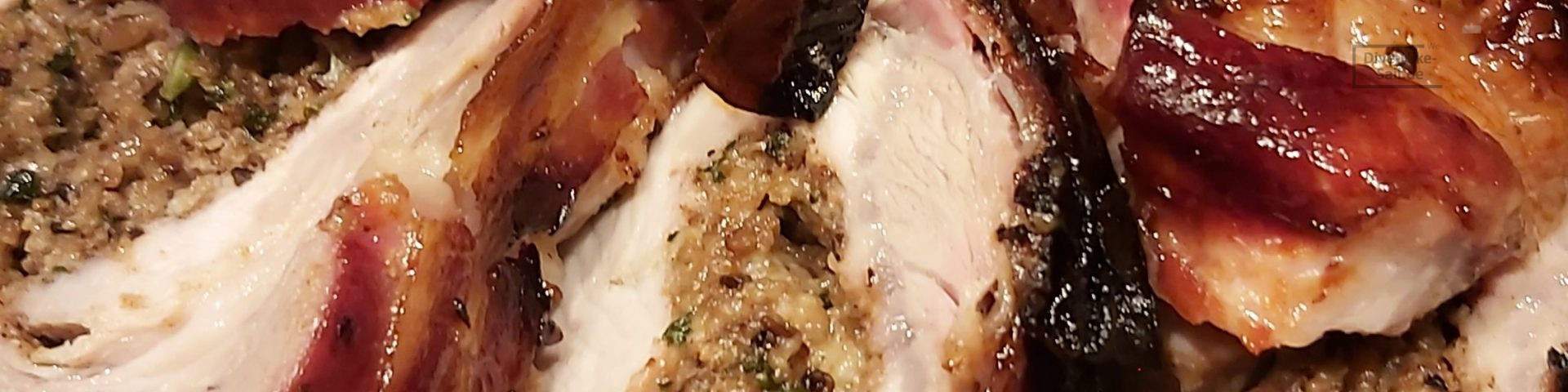 • Den Grill auf 180 Grad heizen und den Braten bei indirekter Hitze ca. 2 Stunden bis zu einer Kerntemperatur von 74-75 Grad grillen. Nach 1 Stunde den Braten einmal wenden damit der Bacon von allen Seiten kross wird.